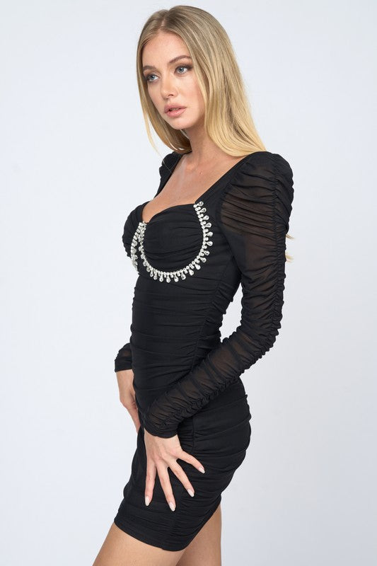 Luxe Rhinestones Fringe Sweetheart Ruched Dress